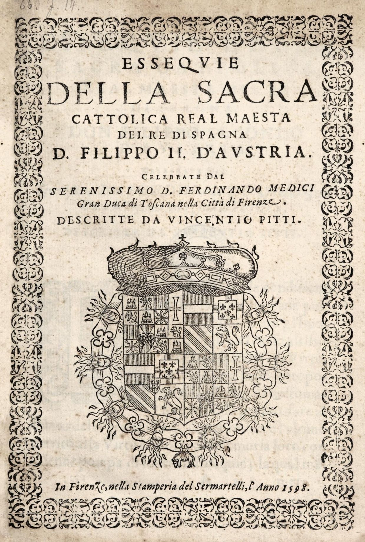 Vincentio Pitti, Essequie della sacra cattolica real maesta del re di Spagna D. Filippo II. D’Austria. Nella stamperia del Sermatelli, In Firenze, 1598.