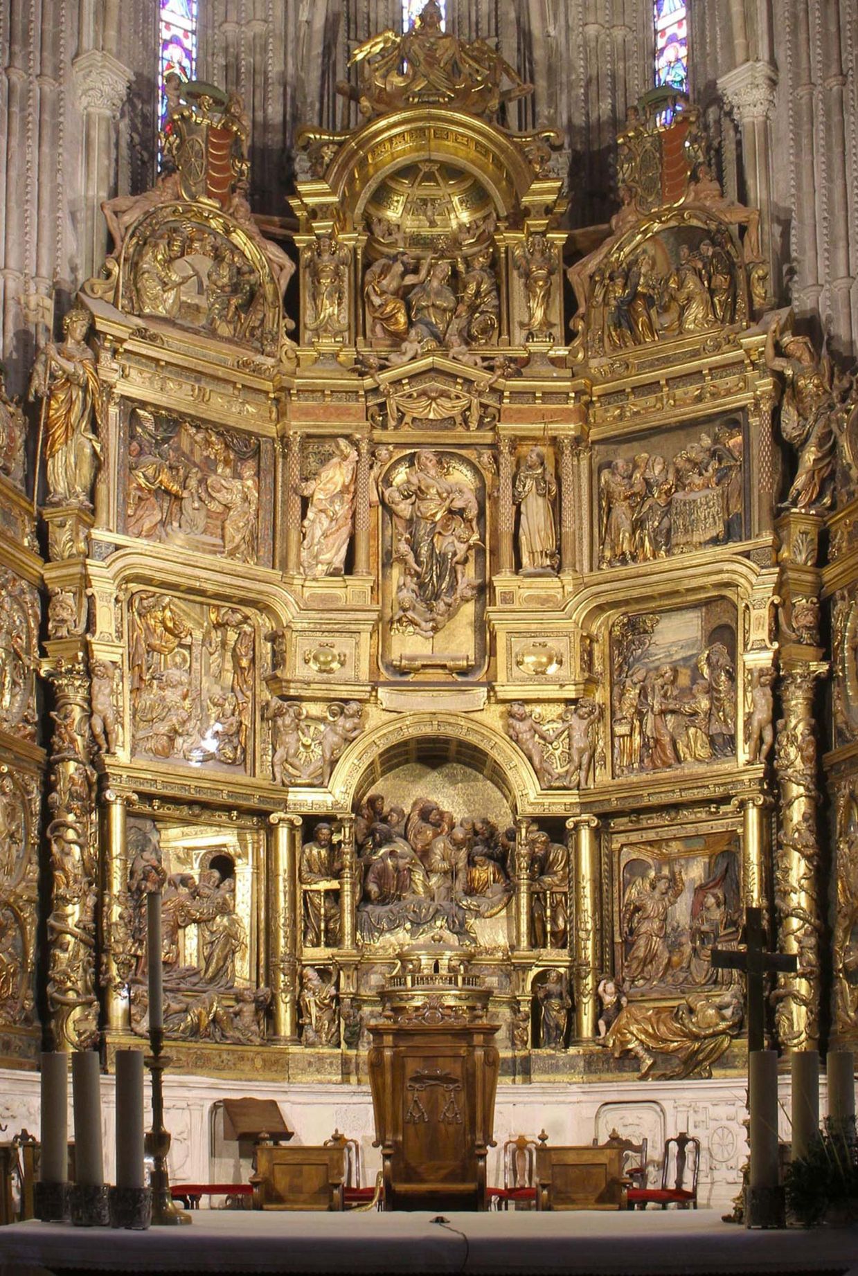 The retable is entirely dedicated to illustrating the virgin Mary’s genealogy and life. It was considered, upon its creation, as “very luxurious”. Its exceptional sculptural quality is emphasized by a great scenographic sense, as shown in the central area, which shows the Dormition of the Virgin.