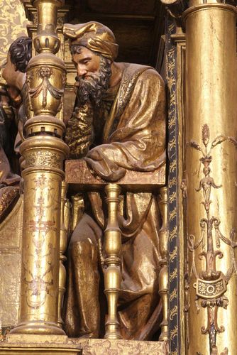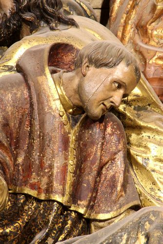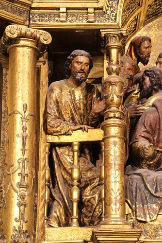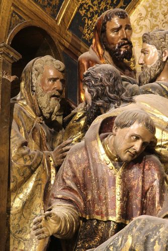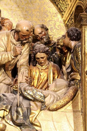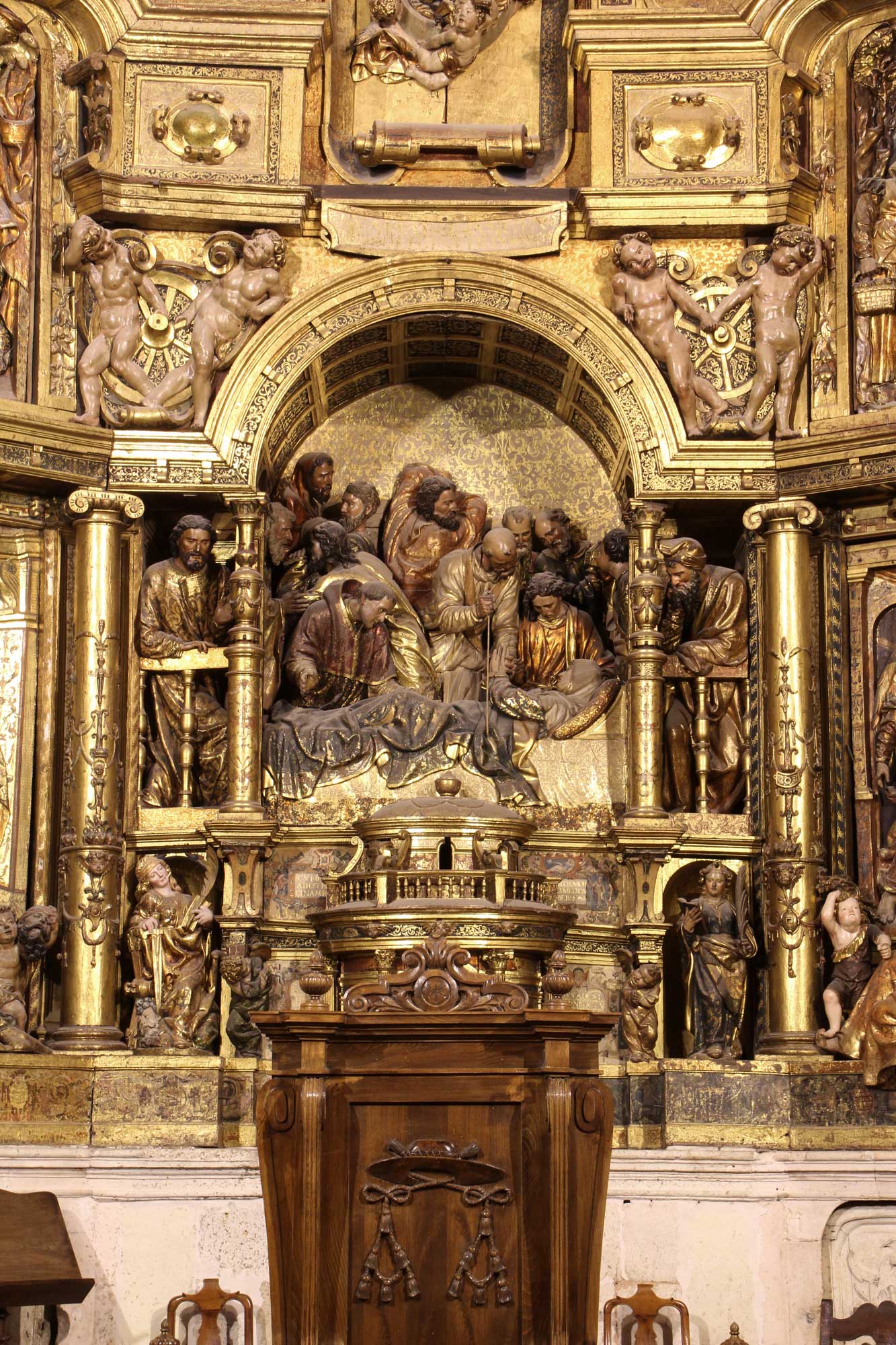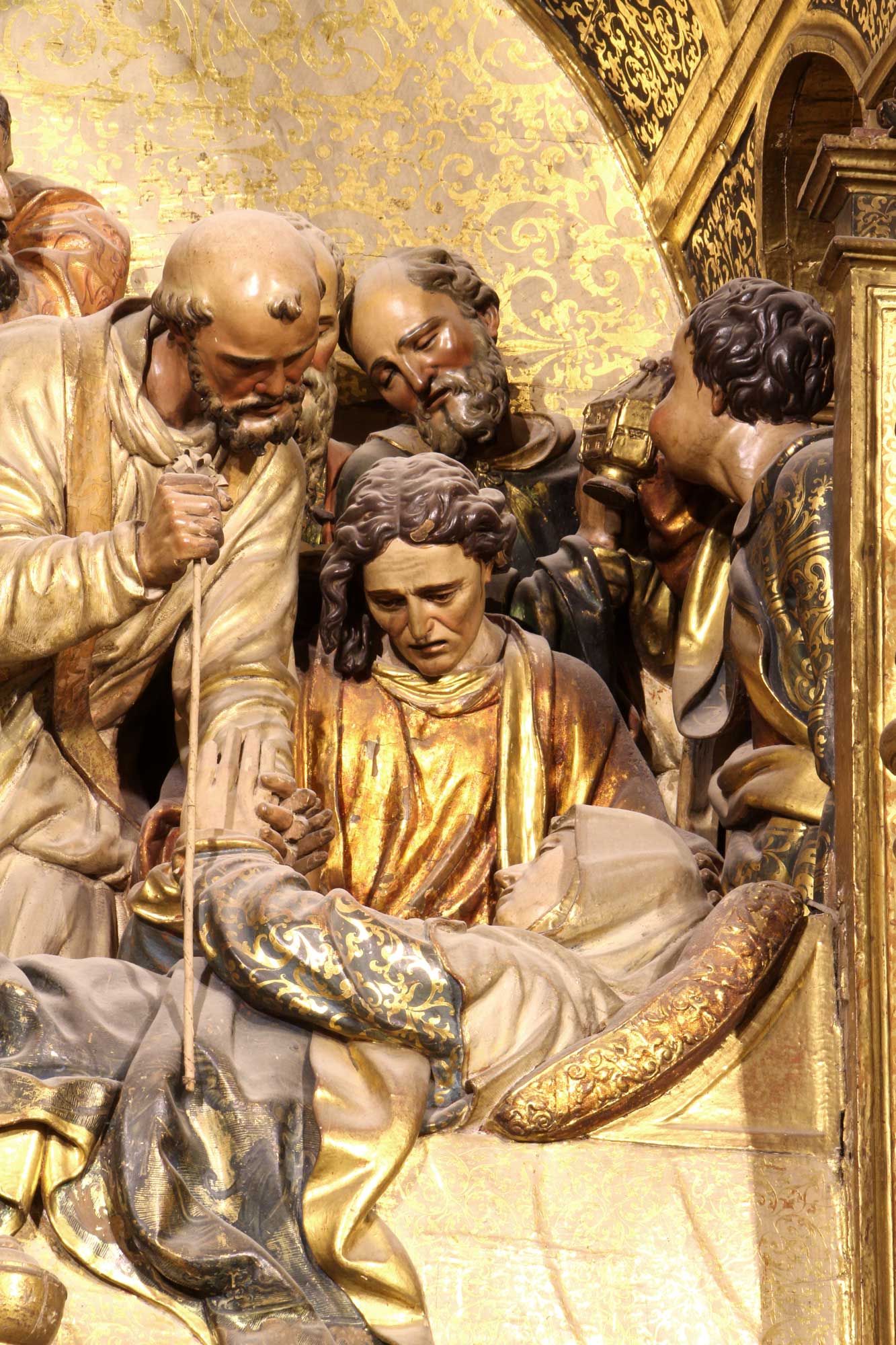 Diese dynamische Darstellungsweise voller Theatralik erreicht ihren Höhepunkt in der Entschlafung der Jungfrau. Um ihr Bett herum stehen einige Apostel und unterhalten sich – einer ist der Bischof da Costa –, andere klagen, während weitere Figuren, an ein Geländer gelehnt, die Szene betrachten. All dies soll die Kraft des Glaubens versinnbildlichen. Solche dynamisierende Erfindungen werden Picardo und Juni später auch bei vielen anderen Werken verwenden.