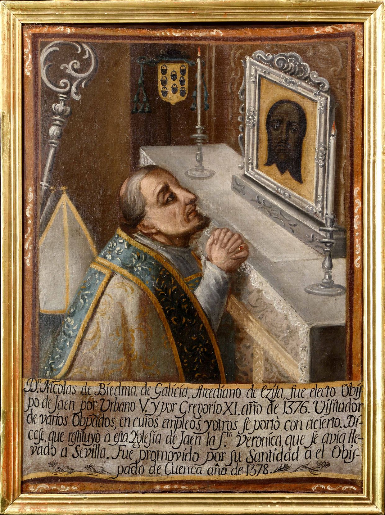 La llegada a Jaén del Santo Rostro o Verónica se ha situado en tiempos del obispo Nicolás de Biedma (1368-1378 y 1381-1383). El prelado pudo recibir la reliquia como regalo del papa Gregorio XI (1370-1378).