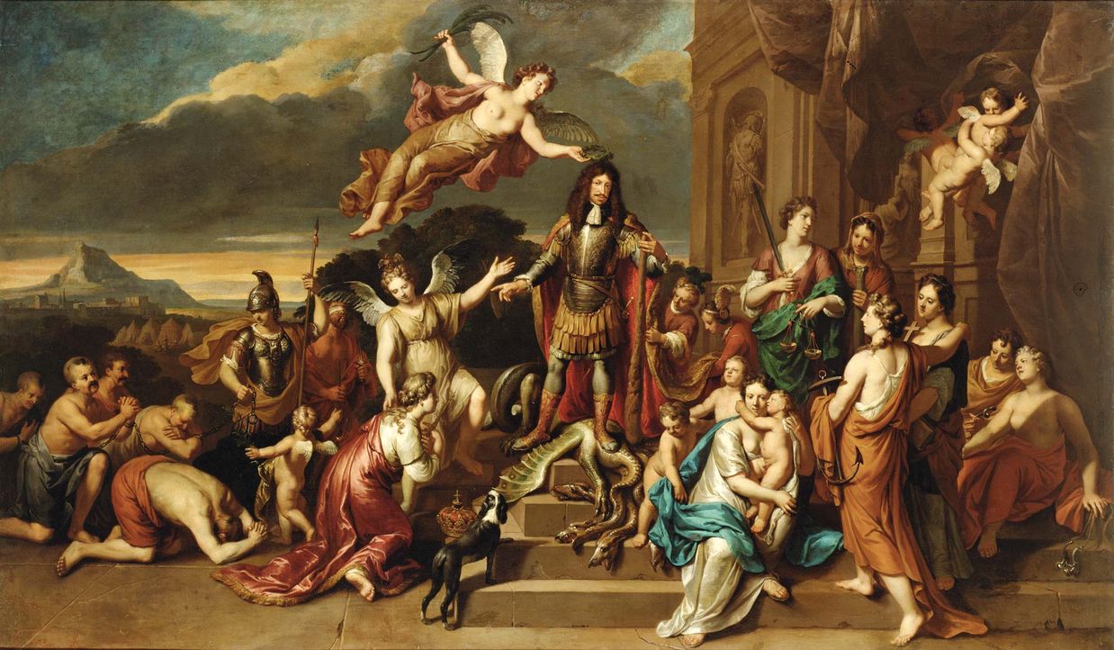 El poder escenográfico y discursivo del vestido es muy evidente en la retratística de la Edad Moderna. La elección del vestido y del tejido con el que pasarías a la posteridad era decisivo para construir la identidad y el rango de la persona retratada, como podemos observar en esta alegoría del Emperador Leopoldo I como héroe Romano, victorioso ante los otomanos.