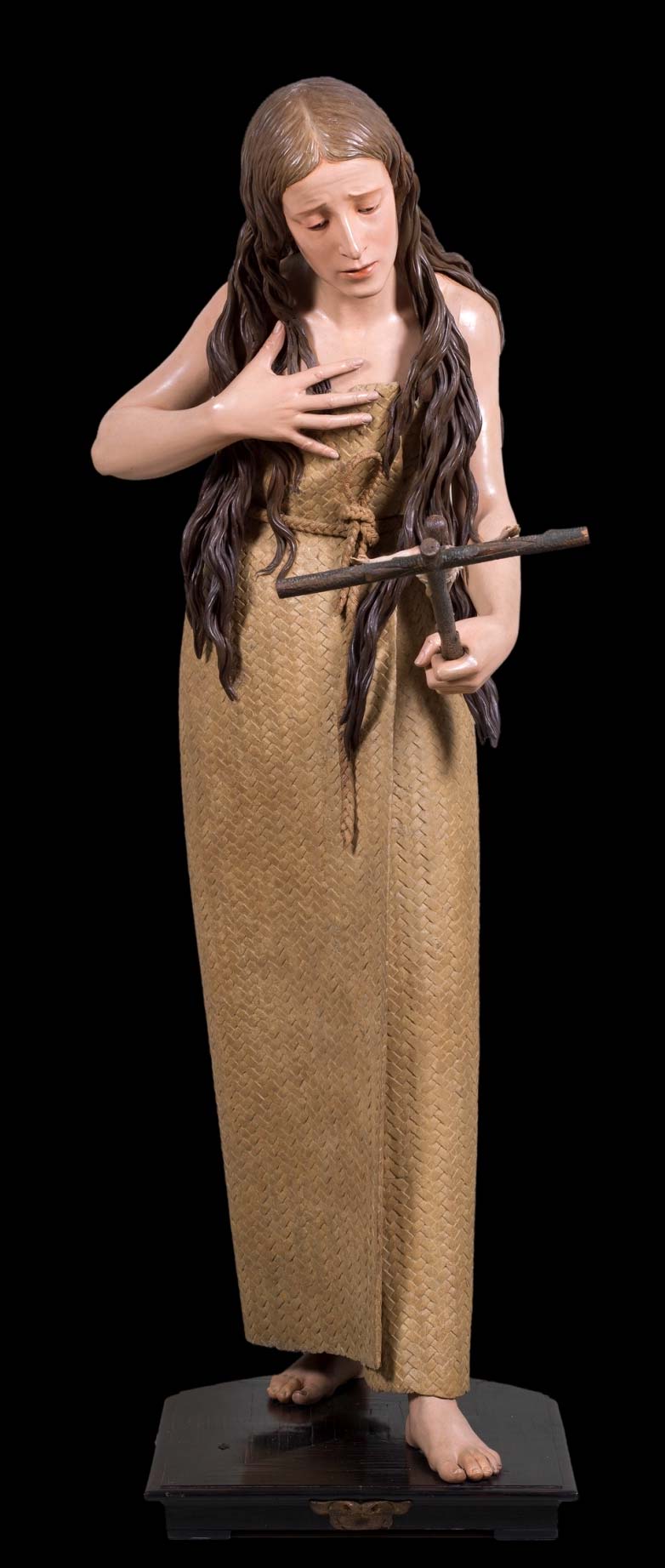 El carácter realista de la escultura nos permite observar con toda precisión la factura del tejido que cubre el cuerpo de la penitente, hasta el punto de transferirnos la sensación áspera y rígida del trenzado de palma del hábito.
